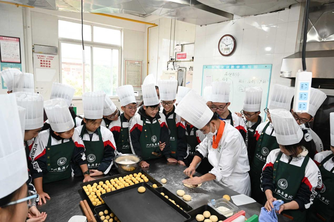 川教融媒 2025-11-21759011月21日,成都西川中学师生走进四川旅游学院,开展以“蜀娃探蜀味·匠道育知行”为主题的食育教育研学活动。本次活动将巴蜀美食文化、劳动教育与生活实践深度融合,引领学生在沉浸式体验中探寻饮食文化根源,锤炼劳动品格,感悟匠心精神。