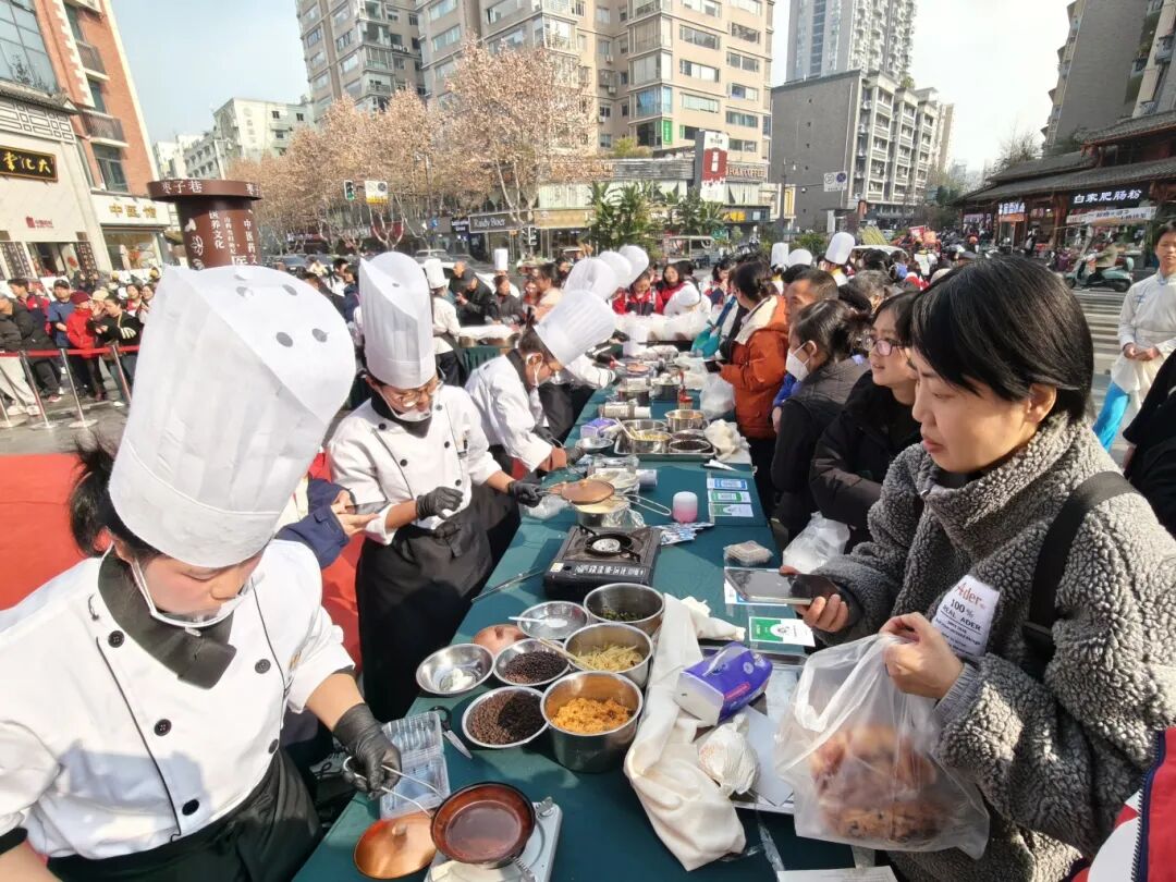 学生摊主“各显神通”“阿姨,尝尝我们的乳酪包!奶香浓郁,外酥里嫩!”财贸学子手持试吃盘,向围拢的居民热情推介。摊位上,各种中式馒头与西式米面包并排陈列,最醒目的当属“成都限定款”——现烤蛋烘糕。金黄酥脆的外皮裹着各类馅料,芝麻香混着面香直钻鼻腔,引得居民争相购买。“我们的糕点主打‘中式保底、西式创新、成都特色’!”学生摊主擦着额头的汗,指尖划过摊位上的糕点介绍道:“中间边是刚出笼的颜色各样的馒头,软糯又有嚼劲,左边是米面包和乳酪包,软糯如云,奶酪香浓得让人直流口水;右边是现烤蛋烘糕,撒了芝麻,老人小孩都爱吃!”当被问及“爆款”糕点时,一位“小老板”翻着记账本笑道:“半小时卖了几百个杂粮馒头!好多阿姨一来就买十多个,说‘给家里人带,比外面买的干净放心’。”谈及活动感受,学生们纷纷感慨:“以前学烹饪只为了考试,现在要把这些卖给叔叔阿姨,得学会介绍‘这个馒头是全麦的,低糖健康’,得应付‘能不能便宜点’的砍价,还得接受‘这个面包太干’的批评——这些都是课本没教的‘实用技能’!”
